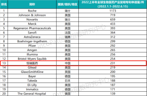 专利是药企最有价值的资产之一,是企业发展的基石,对做原创创新的企业尤为重要。全球专利数据库incoPat创新指数研究中心对2022年1月1日至2022年6月15日公开的全球生物医药产业发明专利申请数量进行统计排名,生物医药产业专利涉及生物技术药、基因工程药物、疫苗、诊断试剂、微生态制剂、血液制品等技术领域。入榜企业/医院主要来自13个国家、组织或地区,罗氏、强生、诺华分别位列前三,利来国际w66医药(231件)排名第13位,领跑中国药企。